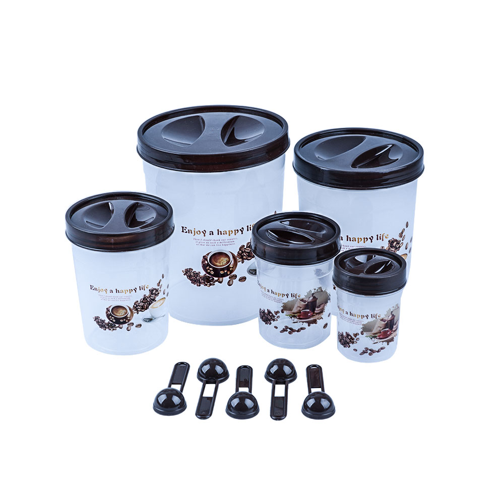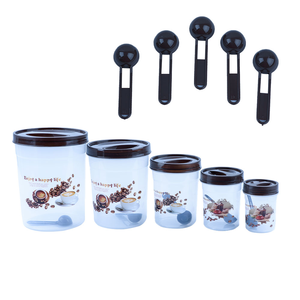 علب حافظة للبهارات والحبوب مع ملاعق خاصة بكل علبة؛ 5 علب مختلفة الاحجام باللون البني