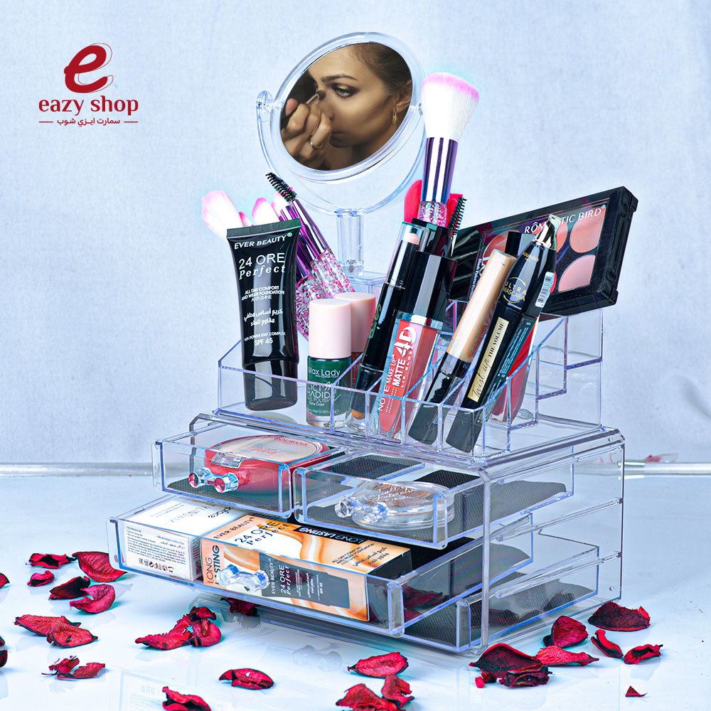 حامل ومنظم ادوات مكياج شفاف رفوف وخانات مع مرايا