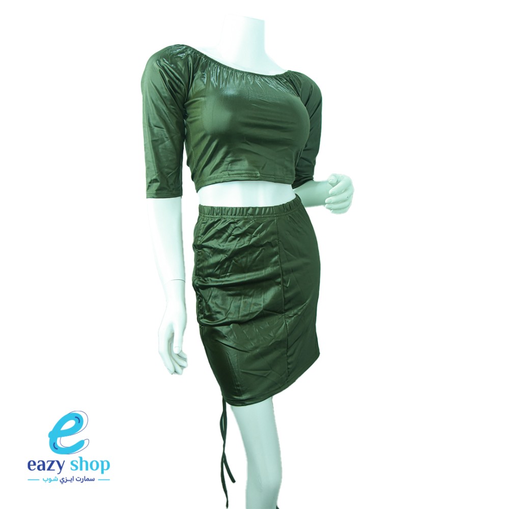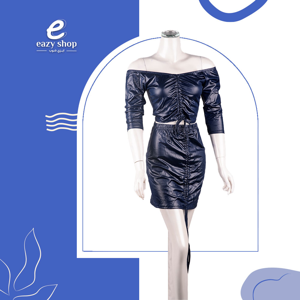 طقم نسائي جلد انيق وراقي يتكون من قطعتين , بلوزة على كتف , كم ميدي , على حبل في النص يعني شكل نص دائري , جذاب وعصري , تنورة على حبل في النص تعطي شكل نصف دائري جذاب , الخصر مطاطي اكثر راحة , مثالي للمناسبات المختلفة , يتميز بالوانه المتعددة