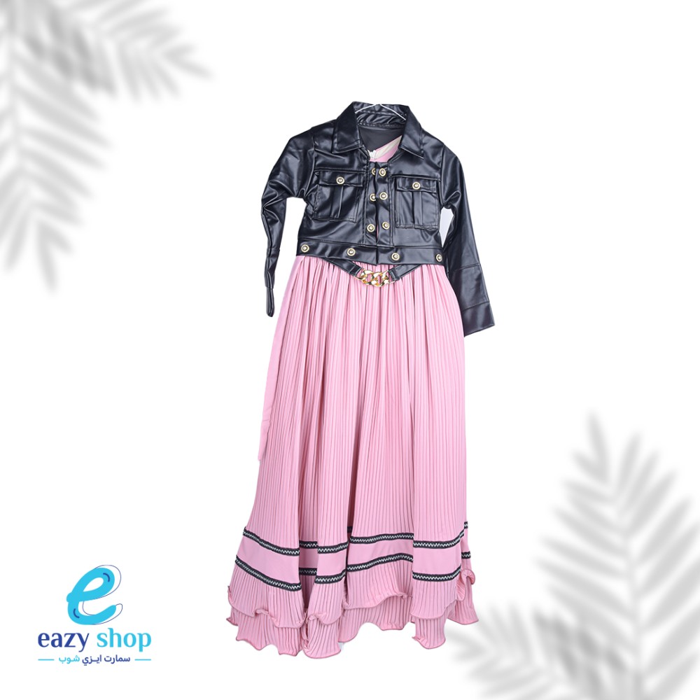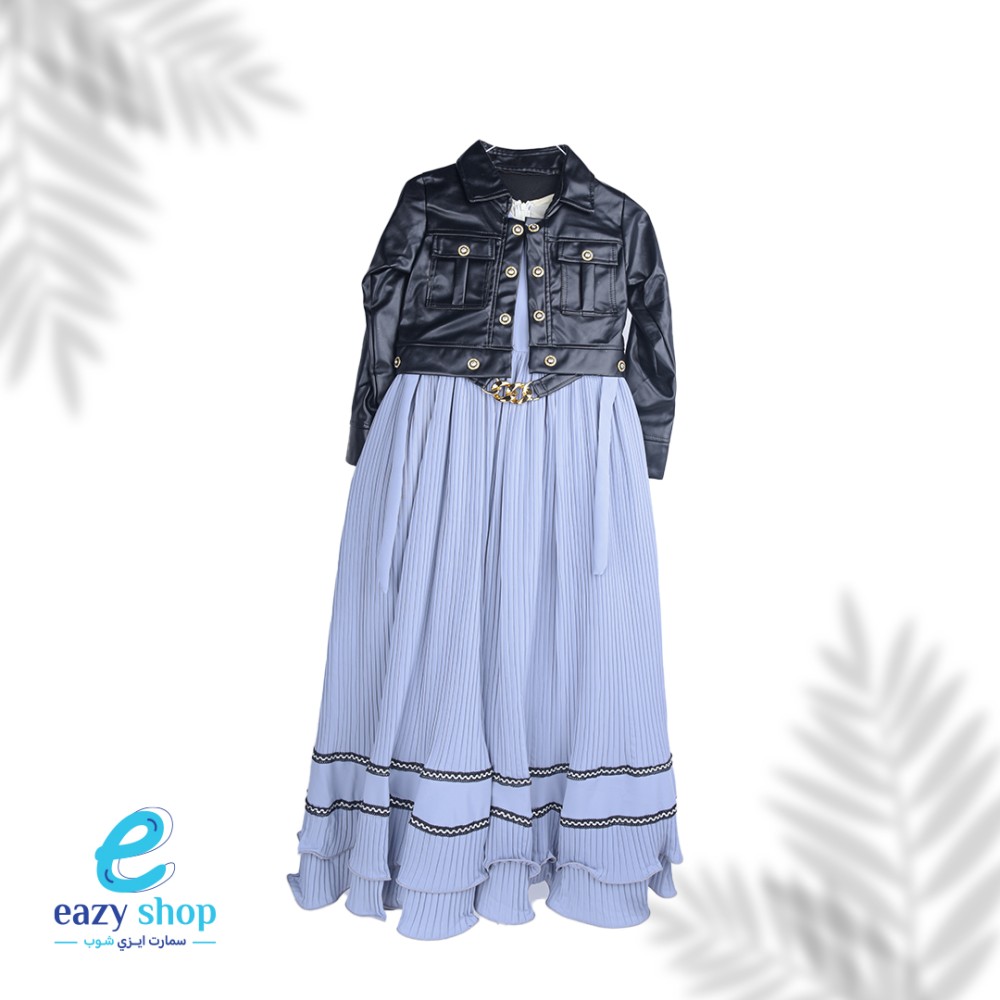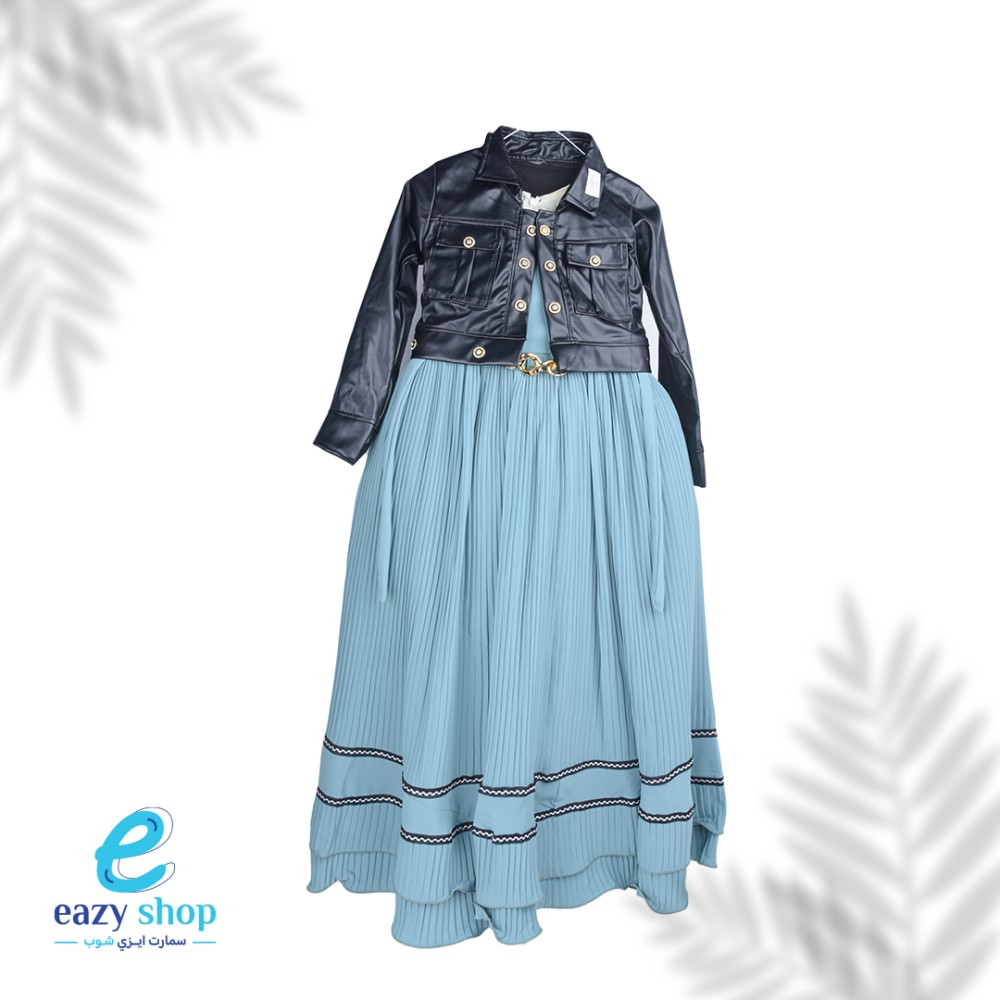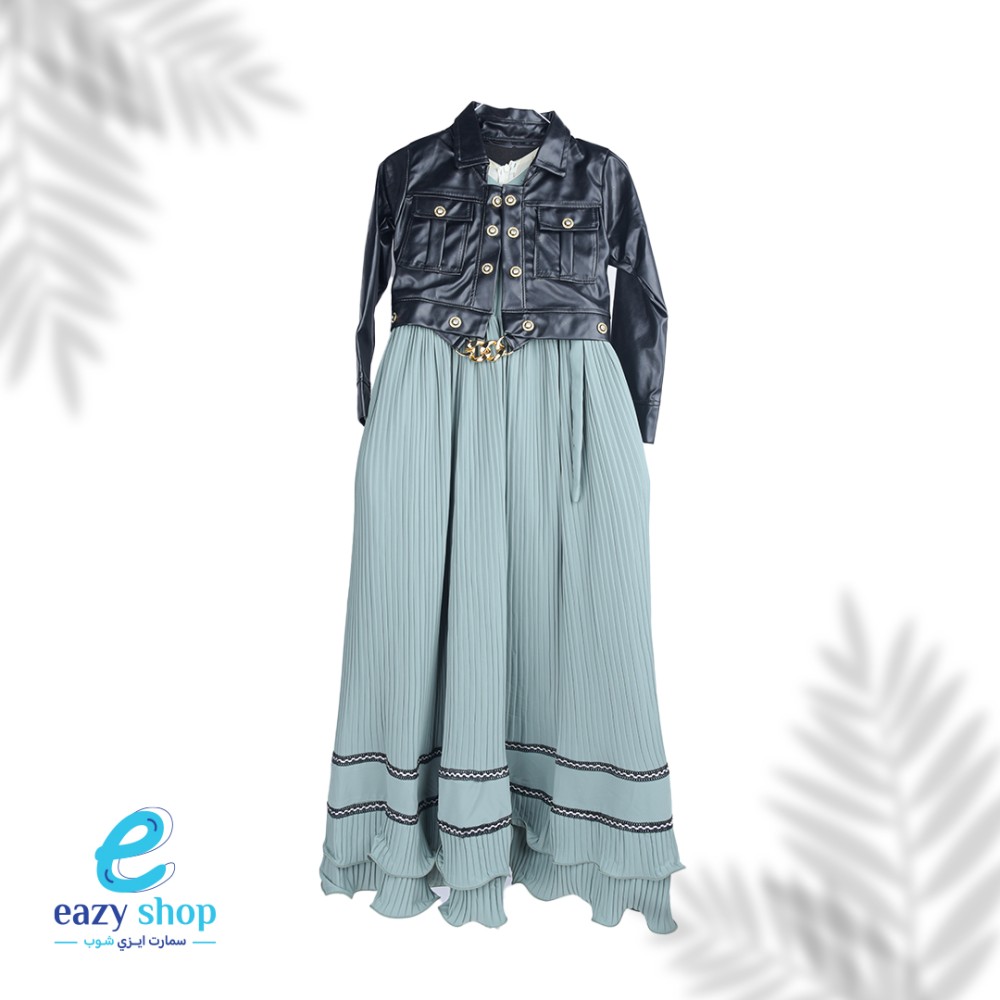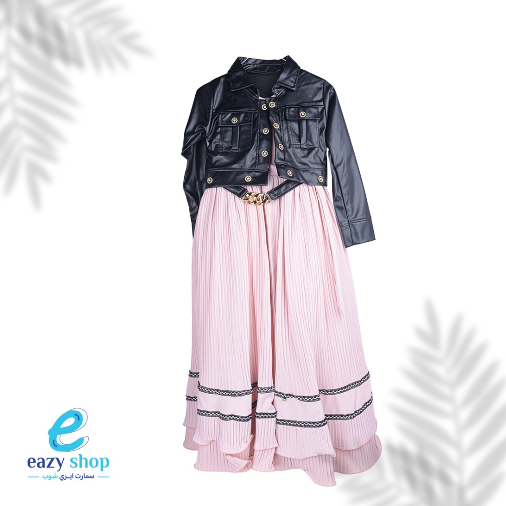 فستان شبابي قطعتين , القطعة الاولى فستان طويل على حزام بالخصر يعطي جمال وقوام جذاب على قصات في الاسفل , القطعة الثاني جاكت جلد مكمم يضيف جاذبيه اكثر على ازرار , يتميز بالوانه المختلفة