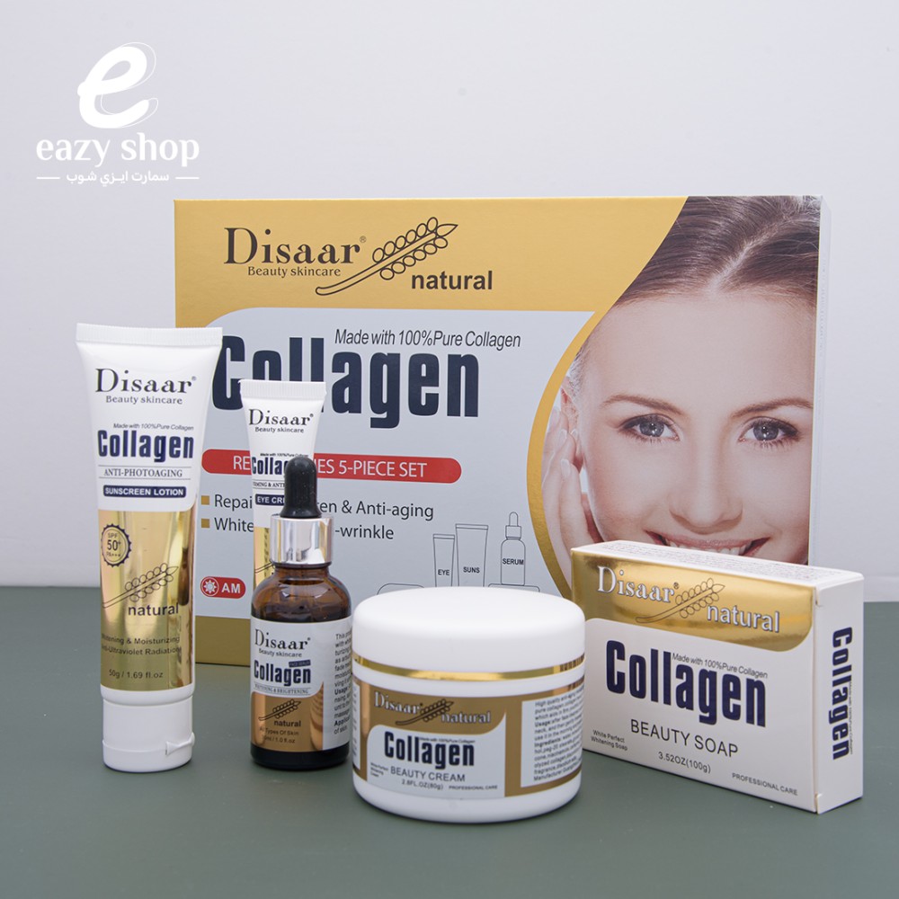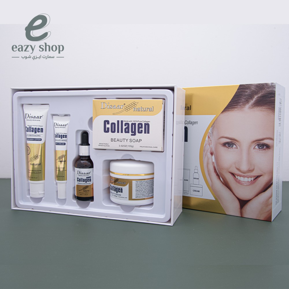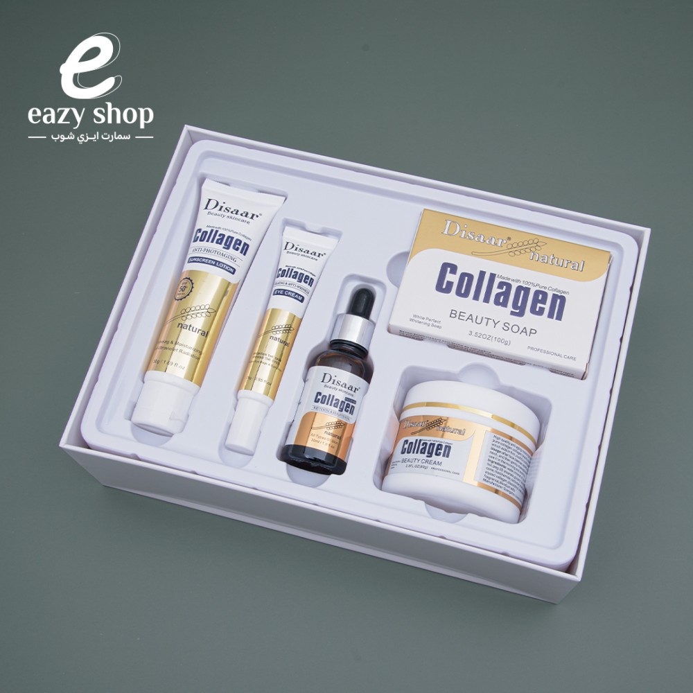 مجموعة الكولاجين الخارقة ترطيب مضاعف لتجاعيد أقل تحمي البشرة من علامات التقدم بالعمر و تحافظ على نضارتها و جمالها يحتوى على خمس قطع (واقي شمس – كريم العين – كريم مرطب – صابون – سيروم)